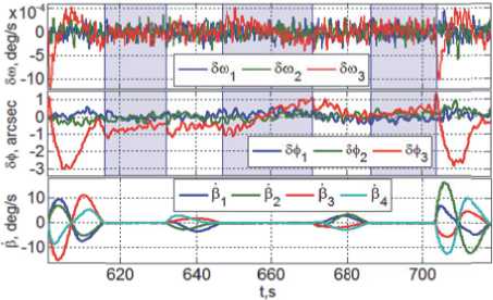 При дискретной фильтрации вектора рассогласования е = -5ф получаются значения вектора е k в моменты времени tk, k е N0 = [0,1,2,..) с периодом Tu, которые применяются в рекуррентном дискретном законе управления кластером гиродинов g,+х = Bgt + С е ^ ; тЛ = К ( gt + Р е ^) ; М f =ГО,Х Gt + J(C ек Е p + [С ек ГО pp Х]ГО, + in J. (4) к +1 k k k k k k k k k к к k к