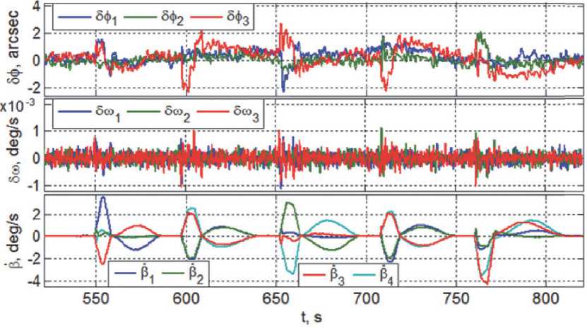 Рис. 16. Погрешности реализации закона наведения и угловые скорости гиродинов вого ускорения, помеченные такими же цветами, и дополнительно приведены вариации модулей этих векторов, отмеченные черным цветом. Результаты на рис. 16 демонстрируют эффективность работы гиросиловой СУД с синтезированными алгоритмами цифрового управления СГК при реализации синтезированного закона наведения, см. рис. 15. Здесь приведены компоненты векторов погрешностей δφ и δω по углам и угловым скоростям, помеченные указанными выше цветами, а также угловые скорости гиродинов.
