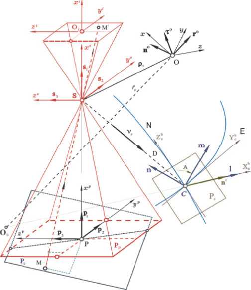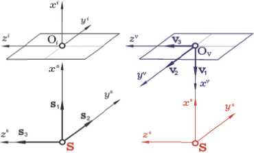 Вводятся телескопная СК (ТСК, оптический базис S с ортами si, i = 1,2,3 = 1 ^ 3 ) с началом в центре проектирования S (см. рис. 2), СК поля изображения Оixlу1 zl (ИСК, базис F с центром Оi в ФИ телескопа), и визирная система координат Оvxvу vz v (ВСК, базис V с ортами vi) с мат