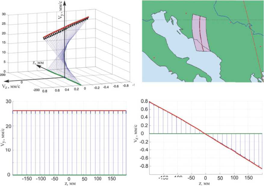 Н е смотря на небольшой недостато к (искривле н ие маршр у та) такая с к анирующа я съёмка обладает важным преимущест в ом - полу ч ение виде о информац и и самого в ысокого качества. На рисунке 6 представлены рас п ределения компонент вектора V y (0, z ) и Vz (0, z ) СД И при съемке с выр а вниванием продольно й скорости д вижения и зображени я .