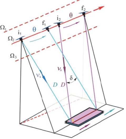 участка земной поверхности в процессе выполнения маршрутов его сканирования, с двумя ракурсами в каждой паре, учитывая невозможность обеспечения постоянства продольной СДИ при соблюдении основного условия D = const стереосъемки, приходится немного изменять значения азимута и продольной СДИ в центре набора ОЭП. На рис. 7 приведена упрощенная схема стереосъемки, где для иллюстрации идеи эта поверхность считается неподвижной плоскостью. Здесь красными линиями отмечены ССО трёх МС при трёх различных значениях их ДВУ Q i, начальных (initial) i j и конечных (final) fj. точках 1-го (j = 1, голубой цвет) и 2-го (j = 2, бордовый цвет) маршрутов. Для получения первой «продольной» стереопары в плоскости орбиты с ДВУ Q 2 начало A первого сканирующего маршрута (СМ1) определяется при угле 51 = —5 / 2 между траверсом точки A на по ложение МС и ортом целеуказания V s на эту точку при заданном угле конвергенции 5 . Это условие определяет также момент времени t^ начала СМ1 и дальность Di(1) = D наблюдения точки A. Начиная с этой точки для СМ1 выполняется расчет закона углового наведения спутника на первом шаге малой длительности Ts по соотношениям (3) при итерационной вариации значений азимута A маршрута и продольной СДИ так, чтобы дальность наблюдения точки на A земном эллипсоиде Di(1) = D . Далее описанная процедура повторяется с периодом Ts в очередной достигнутой точке