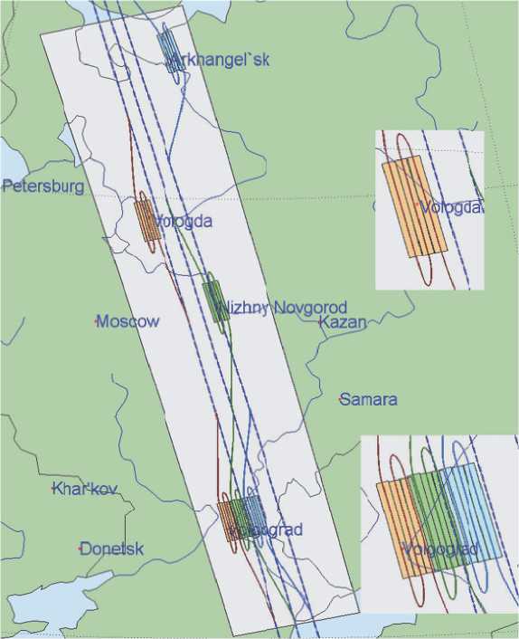 Р и сунок 9 п редставля е т результаты план и рования п л ощадной с ъ емки городов Пово л жья (Волг о град и Нижний Новгород) и Се в еро-Запад н ого регио н а (Вологда и Арха н гельск) в п олосе обз о ра при изменени и геодезич е ской ши-р о ты B от 45.5 до 66 град. В эт о й полосе м о ниторинг выполн я ет одна л о кальная гр у ппа трех минисп у тников: л евый МС#1, оранжевые скан ы ; централь н ый МС#2, з еленые сканы и пр а вый МС#3, с каны голу б ого цвета.