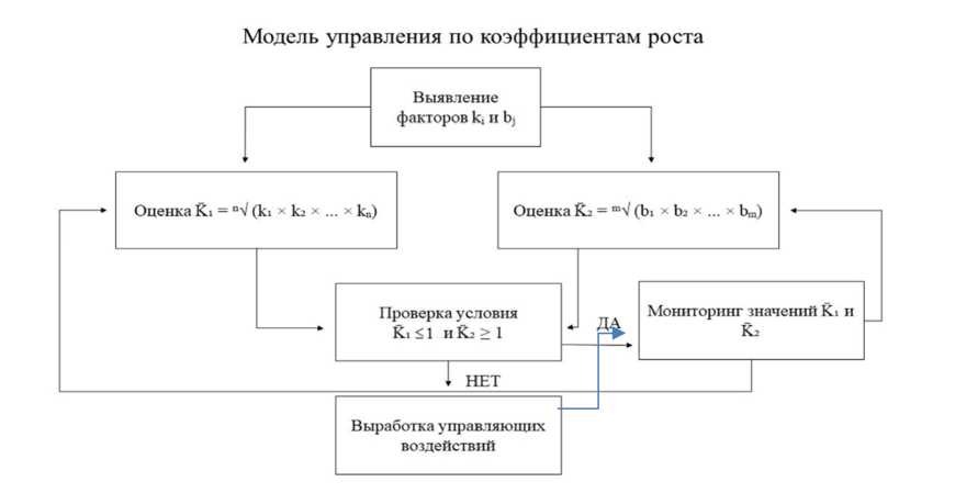 Выявление факторов, обусловивших негативную ситуацию, осуществляется путем анализа индивидуальных коэффициентов роста kᵢ и bⱼ. Необходимо идентифицировать те показатели, динамика которых является наиболее неблагоприятной, то есть показатели первой категории, значения которых выросли наиболее существенно, и показатели второй категории, значения которых снизились наиболее существенно. Именно эти показатели требуют первоочередного внимания и разработки управляющих воздействий. Графически модель управления по коэффициентам роста представлена на рисунке.