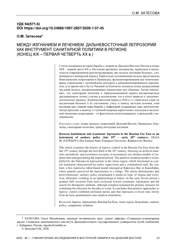 This article examines the history of leprosy control in the Russian Far East from the late 19th century through the first third of the 20th century. Drawing on archival materials, periodicals, and eyewitness accounts, it reconstructs two distinct models of isolation that emerged during the imperial period. The punitive‑isolation model is exemplified by the Nikolaevsk leprosarium in the Amur region, which functioned as a penal institution characterized by police supervision and a criminalized staff. By contrast, a less repressive labor‑based model emerged at Rakovaya Bay in Kamchatka, where patients perceived the leprosarium as a refuge. The article demonstrates that prerevolutionary sanitary policy perpetuated a medieval logic of stigma and exclusion, ultimately resulting in an epidemiological failure. In the early Soviet period a gradual shift occurred from mere exclusion toward systematic registration and the search for therapeutic methods, although isolation remained the primary measure for containing the infection for decades to come. It concludes that punitive approaches to leprosy control exhibited profound inertia and that leprosaria evolved only slowly from de facto penitentiaries into medical institutions.