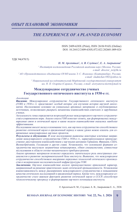 Введение. Международное сотрудничество Государственного оптического института (ГОИ) в 1930-х гг. представляет особый интерес для изучения истории научной дипломатии. Исследование основано на уникальных архивных материалах и опубликованных источниках, позволяющих раскрыть механизмы взаимодействия советских и зарубежных ученых. Актуальность темы определяется возросшей ролью международного научного сотрудничества в современном мире. Анализ опыта ГОИ помогает понять, как формировались международные связи в оптической науке и какие модели взаимодействия оказались наиболее эффективными. Исследование вносит вклад в понимание того, как научное сотрудничество способствовало развитию оптической науки в предвоенный период и какие уроки можно извлечь для современных международных научных проектов. Результаты и обсуждение. В ходе исследования выявлены некоторые ключевые направления международного сотрудничества ГОИ в 1930-е гг., характеризующиеся преимущественно двусторонним взаимодействием с научными центрами Германии, Франции, США, Великобритании, Голландии и других стран. Установлено, что основными формами сотрудничества выступали заграничные командировки, обмен специалистами, совместные исследования в области оптико-механического приборостроения. Анализ архивных материалов позволил определить значительную роль иностранных специалистов в развитии экспериментальной базы института. Выявлено, что международное сотрудничество способствовало внедрению передовых технологий оптического производства и модернизации исследовательской инфраструктуры ГОИ. Заключение. Научное взаимодействие носило преимущественно прикладной характер, направленный на решение практических задач оптической промышленности. Установлена взаимозависимость между расширением международного сотрудничества и повышением качества оптических исследований в предвоенный период. Кроме того, международное сотрудничество стало важным фактором развития оптической науки в СССР, способствуя технологическому прогрессу и формированию научного потенциала института.