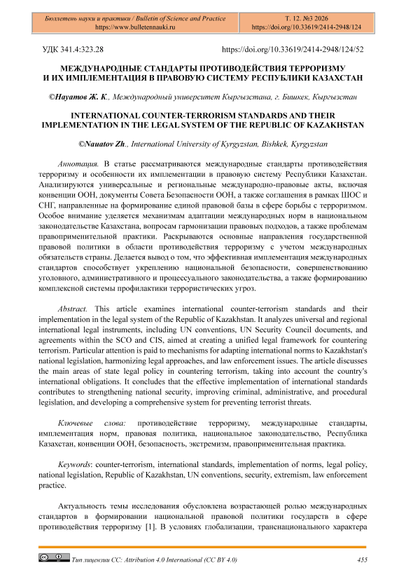 В статье рассматриваются международные стандарты противодействия терроризму и особенности их имплементации в правовую систему Республики Казахстан. Анализируются универсальные и региональные международно-правовые акты, включая конвенции ООН, документы Совета Безопасности ООН, а также соглашения в рамках ШОС и СНГ, направленные на формирование единой правовой базы в сфере борьбы с терроризмом. Особое внимание уделяется механизмам адаптации международных норм в национальном законодательстве Казахстана, вопросам гармонизации правовых подходов, а также проблемам правоприменительной практики. Раскрываются основные направления государственной правовой политики в области противодействия терроризму с учетом международных обязательств страны. Делается вывод о том, что эффективная имплементация международных стандартов способствует укреплению национальной безопасности, совершенствованию уголовного, административного и процессуального законодательства, а также формированию комплексной системы профилактики террористических угроз.