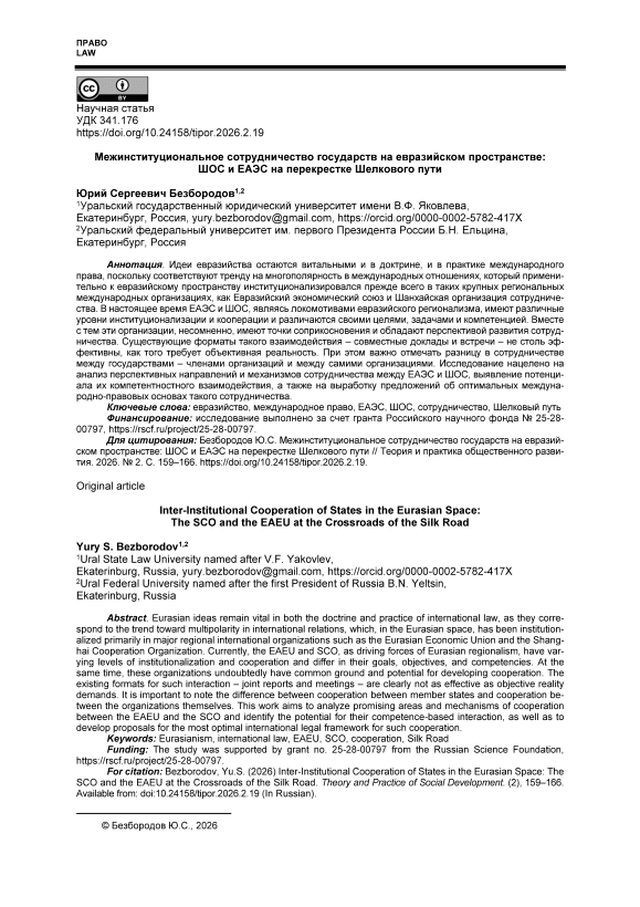 Eurasian ideas remain vital in both the doctrine and practice of international law, as they correspond to the trend toward multipolarity in international relations, which, in the Eurasian space, has been institutionalized primarily in major regional international organizations such as the Eurasian Economic Union and the Shanghai Cooperation Organization. Currently, the EAEU and SCO, as driving forces of Eurasian regionalism, have varying levels of institutionalization and cooperation and differ in their goals, objectives, and competencies. At the same time, these organizations undoubtedly have common ground and potential for developing cooperation. The existing formats for such interaction – joint reports and meetings – are clearly not as effective as objective reality demands. It is important to note the difference between cooperation between member states and cooperation between the organizations themselves. This work aims to analyze promising areas and mechanisms of cooperation between the EAEU and the SCO and identify the potential for their competence-based interaction, as well as to develop proposals for the most optimal international legal framework for such cooperation.