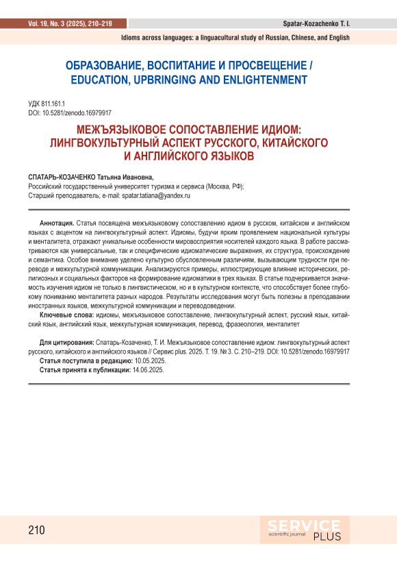 Статья посвящена межъязыковому сопоставлению идиом в русском, китайском и английском языках с акцентом на лингвокультурный аспект. Идиомы, будучи ярким проявлением национальной культуры и менталитета, отражают уникальные особенности мировосприятия носителей каждого языка. В работе рассматриваются как универсальные, так и специфические идиоматические выражения, их структура, происхождение и семантика. Особое внимание уделено культурно обусловленным различиям, вызывающим трудности при переводе и межкультурной коммуникации. Анализируются примеры, иллюстрирующие влияние исторических, религиозных и социальных факторов на формирование идиоматики в трех языках. В статье подчеркивается значимость изучения идиом не только в лингвистическом, но и в культурном контексте, что способствует более глубокому пониманию менталитета разных народов. Результаты исследования могут быть полезны в преподавании иностранных языков, межкультурной коммуникации и переводоведении.