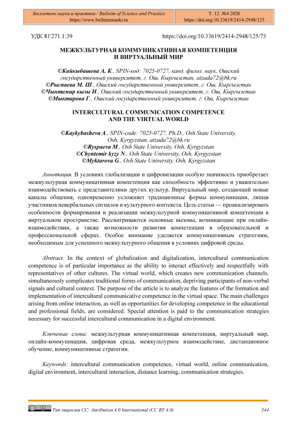 Современное общество вступает в новую фазу развития, характеризующуюся одновременными процессами глобализации и цифровизации. Эти процессы расширяют границы взаимодействия между людьми и культурами, создавая условия, в которых способность к эффективному межкультурному общению становится неотъемлемой частью профессиональной и социальной жизни. Особенно актуальной эта задача становится в условиях виртуального общения, где традиционные формы коммуникации претерпевают трансформацию. В данной статье рассматривается феномен межкультурной коммуникативной компетенции в контексте виртуального мира — среды, где происходят образовательные, деловые и межличностные контакты между представителями разных культур. Цель исследования — выявить особенности формирования и применения межкультурной коммуникативной компетенции в виртуальном пространстве, а также обозначить основные вызовы и возможности, которые предоставляет эта среда. Межкультурная коммуникативная компетенция (МККК) представляет собой комплекс знаний, умений и установок, обеспечивающих эффективное, уважительное и этически выверенное взаимодействие между представителями различных культур. В отличие от широкой межкультурной компетенции, акцент в данном случае делается на процессе коммуникации — то есть на умении воспринимать, интерпретировать и адекватно реагировать на речевые и неречевые послания, поступающие от собеседника, принадлежащего к другой культурной системе. По мнению М. Байрама, МККК включает в себя несколько составляющих: лингвистическую осведомлённость, интерпретативные навыки, критическое понимание культурных различий и способность к диалогу [1].