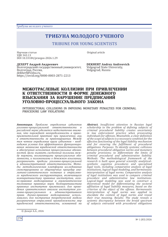 Insufficient attention in Russian legal scholarship to the problem of defining subjects of criminal procedural liability creates uncertainty in law enforcement practice when prosecuting individuals for offenses. Meanwhile, a clear definition of the scope of subjects is a necessary condition for the effective functioning of the legal liability mechanism and for ensuring the fulfillment of procedural obligations. Purposes: To identify systemic collisions between procedural obligation norms and monetary penalty provisions; to differentiate the limits of criminal procedural and administrative liability. Methods: The methodological framework of the research is built upon general scientific analytical-synthetic cognitive procedures and specialized legal tools, including comparative analysis of legal institutions, logical-legal modeling, and hermeneutic interpretation of legal norms. Comparative analysis of legal institutions was used to compare criminal procedure and administrative law institutions. Logical-legal modeling was used to construct a theoretical model for differentiating the sectoral affiliation of legal liability measures, based on the criterion of the object of the offense. Hermeneutic interpretation of legal norms was applied to elucidate the content of legal norms and reveal their true meaning. Results: The study reveals a systemic discrepancy between the broad spectrum of subjects entrusted with procedural obligations (Part 4 of Article 21, Article 257 of the Criminal Procedure Code of the Russian Federation) and the restricted category of individuals subject to monetary penalties (Articles 117–118 of the Criminal Procedure Code of the Russian Federation). Furthermore, the research uncovers a practice of substituting criminal procedural liability with administrative liability by applying Articles 17.7 and 17.3 of the Code of Administrative Offenses of the Russian Federation to violations committed within the framework of criminal proceedings.
