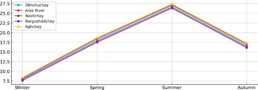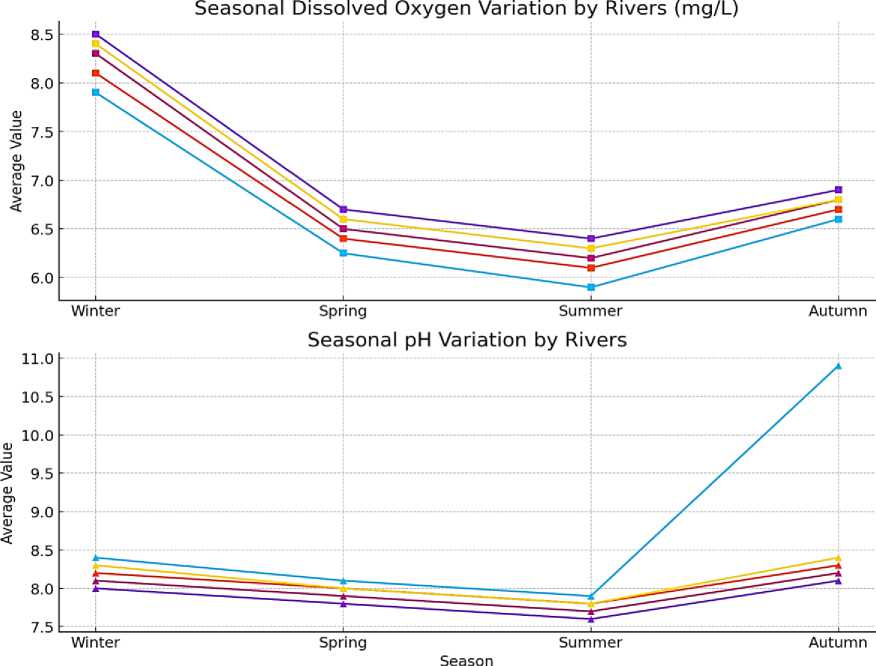 Therefore, oxygen scarcity can occur in ecosystems under thermal stress. Dissolved oxygen in water directly influences the life processes of various organisms living in river ecosystems and is essential for maintaining their normal functioning. At the same time, dissolved oxygen plays a key role in the biological purification processes carried out in rivers. During these processes, bacteria and other microorganisms utilize oxygen to break down organic matter, contributing to the selfpurification of rivers and the improvement of water quality. Thus, the amount of oxygen present in water is not only vital for the health of the ecosystem, but also for ensuring nutrient cycling and the sustainable functioning of river systems. Based on the data presented in Table 1, the amount of dissolved oxygen in the studied river waters showed seasonal variation. Specifically, this parameter ranged from 7.7 to 8.5 mg/L in winter, 6.25 to 6.7 mg/L in spring, 5.6 to 5.9 mg/L in summer, and 6.6 to 6.9 mg/L in autumn. This variability is mainly related to water temperature. It is known that as water temperature increases, its capacity to dissolve oxygen decreases. This explains why the amount of dissolved oxygen is lower in the summer months compared to other seasons.