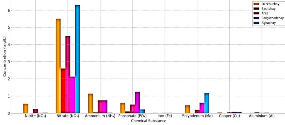According to the Maximum Permissible Limits (MPL): Nitrite (NO₂⁻) — 3.3 mg/L, Nitrate (NO₃⁻) — 45.0 mg/L, Phosphorus (PO₄³⁻ ) — 0.001 mg/L, Ammonium (NH₄⁺) — 0.5 mg/L, Phenol — 0.001 mg/L , Zinc (Zn) — 1.0 mg/L, Copper (Cu) — 1.0 mg/L, Aluminium (Al) — 0.5 mg/L, Iron (Fe) — 0.3 mg/L, Molybdenum (Mo) — 0.05 mg/L (Figure 2).