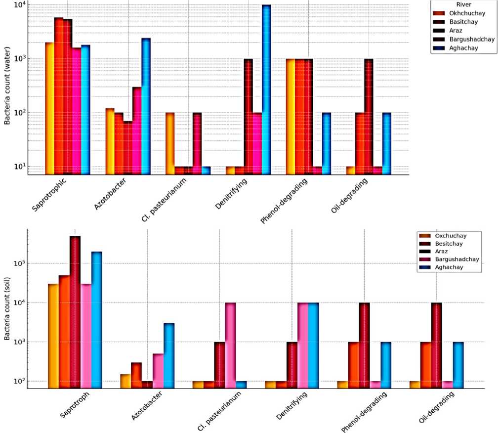 Oil and phenol-degrading bacteria were also identified at all observation points, indicating the presence of industrial and domestic organic pollutants in the ecosystem. Furthermore, Escherichia coli, Salmonella, and Shigella, which are indicators of fecal contamination from human and animal sources, were detected at some stations, albeit in low quantities. The conducted studies indicate that the transboundary rivers located in the Eastern Zangazur economic region-Okhchuchay, Araz, Basitchay, Bargushadchay, and Aghachay-are already in a significantly polluted state upon entering the territory of Azerbaijan. This pollution primarily originates from industrial and agricultural activities in Armenia and other upstream countries, as well as the direct discharge of untreated wastewater into the rivers. Physicochemical and microbiological analyses have revealed elevated levels of water temperature, pH, dissolved oxygen, biogenic elements, heavy metals, and pathogenic microorganisms. Particularly during the summer months, increased temperatures lead to a decrease in dissolved oxygen levels, causing biological stress within river ecosystems and negatively impacting the vital activities of aquatic organisms. Additionally, the presence of pathogenic bacteria such as Escherichia coli, Salmonella, and Shigella poses a serious threat to human health.
