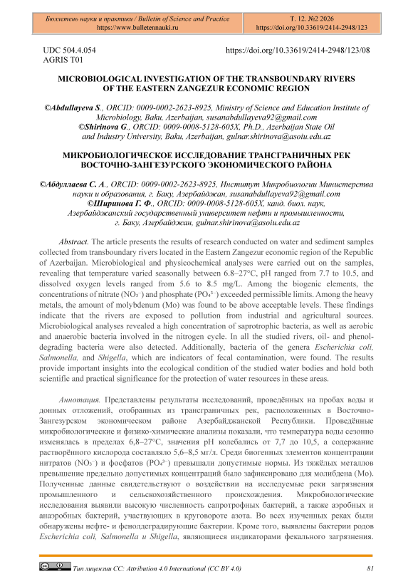 Initially, the physico-chemical properties of the river water were assessed including temperature, transparency, pH value, the amount of dissolved oxygen, and the levels of biogenic elements (such as nitrites, nitrates, ammonium ions, and phosphates) as well as heavy metals like iron (Fe), molybdenum (Mo), copper (Cu), aluminum (Al), and others. In addition, microbiological studies were conducted on samples collected from both the river water and the sediment layers of the riverbeds. These studies focused on saprotrophic, oil and phenol-degrading, and nitrogen-cycling bacteria. Among pathogenic microorganisms, the presence and spread of species such as Escherichia coli, Salmonella, and Shigella were analyzed. The findings revealed that all of the mentioned transboundary rivers are already contaminated with various pollutants including household waste, agricultural residues, heavy metals, and other toxic substances by the time they enter Azerbaijan’s territory. This poses a serious threat to the ecological status of the region, the environment, and public health.