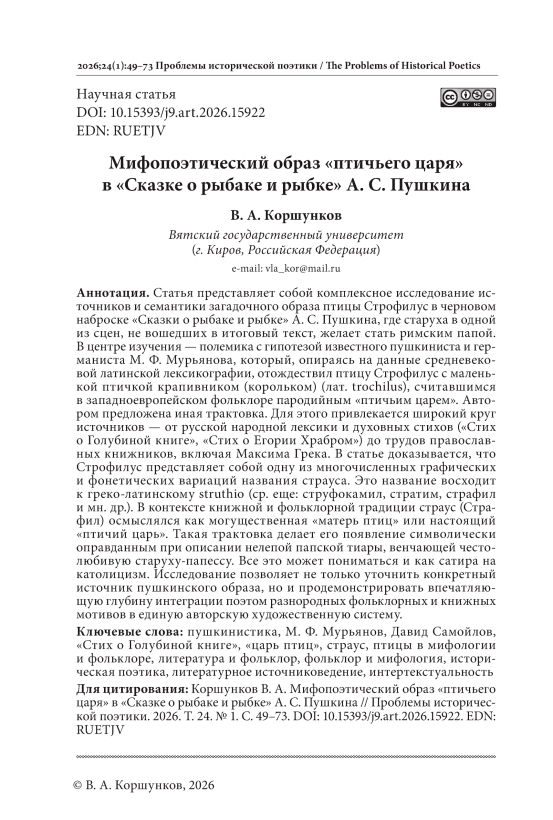 Статья представляет собой комплексное исследование источников и семантики загадочного образа птицы Строфилус в черновом наброске «Сказки о рыбаке и рыбке» А. С. Пушкина, где старуха в одной из сцен, не вошедших в итоговый текст, желает стать римским папой. В центре изучения — полемика с гипотезой известного пушкиниста и германиста М. Ф. Мурьянова, который, опираясь на данные средневековой латинской лексикографии, отождествил птицу Строфилус с маленькой птичкой крапивником (корольком) (лат. trochilus), считавшимся в западноевропейском фольклоре пародийным «птичьим царем». Автором предложена иная трактовка. Для этого привлекается широкий круг источников — от русской народной лексики и духовных стихов («Стих о Голубиной книге», «Стих о Егории Храбром») до трудов православных книжников, включая Максима Грека. В статье доказывается, что Строфилус представляет собой одну из многочисленных графических и фонетических вариаций названия страуса. Это название восходит к греко-латинскому struthio (ср. еще: струфокамил, стратим, страфил и мн. др.). В контексте книжной и фольклорной традиции страус (Страфил) осмыслялся как могущественная «матерь птиц» или настоящий «птичий царь». Такая трактовка делает его появление символически оправданным при описании нелепой папской тиары, венчающей честолюбивую старуху-папессу. Все это может пониматься и как сатира на католицизм. Исследование позволяет не только уточнить конкретный источник пушкинского образа, но и продемонстрировать впечатляющую глубину интеграции поэтом разнородных фольклорных и книжных мотивов в единую авторскую художественную систему.
