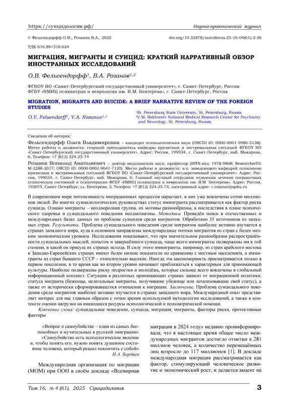 Миграция, мигранты и суицид: краткий нарративный обзор иностранных исследований