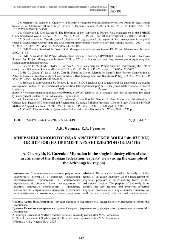 Статья посвящена анализу результатов экспертного интервью в вопросах управления миграционными процессами в моногородах Архангельской области. Цель исследования – выявить ключевые особенности и проблемы, влияющие на миграционные процессы в условиях монопрофильности экономики, а также природно-климатических и социально-экономических характеристиках региона. Проведенный анализ подчеркивает необходимость разработки и реализации дифференцированных стратегий управления миграцией, учитывающих уникальную специфику каждого моногорода.