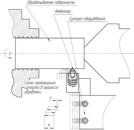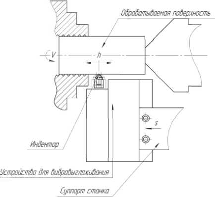 На рисунке 8 представлена схема реализации возвратно-поступательного движения индентора с помощью привода суппорта токарного станка, позволяющая производить обработку вибровыглаживанием без применения специальных устройств, где h – ход возвратно поступательного движения индентора, S – осевая подача, V – направление вращения заготовки.
