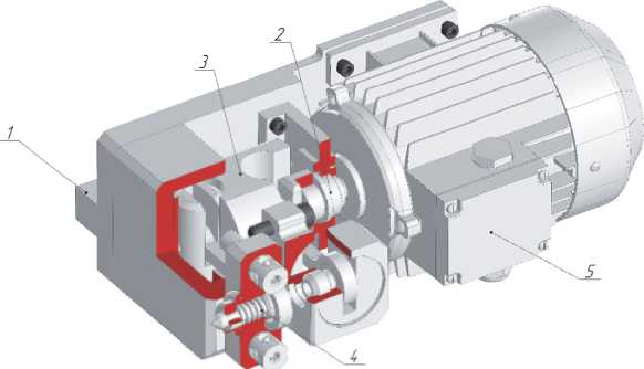 Устройство состоит из пяти основных функциональных блоков: блок 1 – корпус, обеспечивающий фиксацию основных модулей, а также технологическую совместимость с оборудованием, путем подбора кронштейна исходя из типоразмера посадочного места в станке; блок 2 – электродвигатель для создания осциллирующего движения; 3 – блок преобразования вращательного движения в возвратно-поступательное, схема которого представлена на рисунке 11; 4 – блок регулировки амплитуды хода индентора; 5 – блок выглаживания.