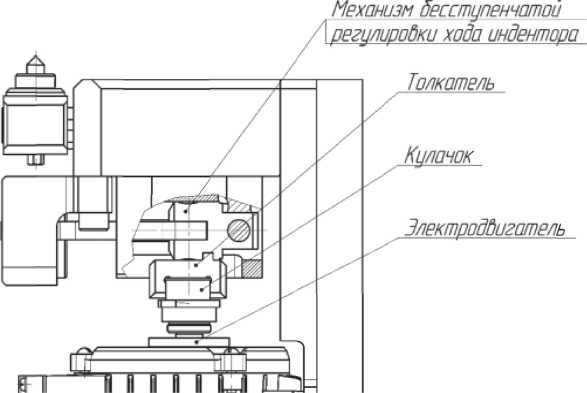 Преобразование вращательного движения вала электродвигателя в возвратно-поступательное происходит за счет кулачка с симметричным профилем и двустороннего толкателя, передающему движение на механизм бесступенчатой регулировки хода индентора. Применение кулачка с симметричным профилем в паре с двухсторонним толкателем позволяет механизму функционировать без применения в конструкции возвратной пружины. Блок бесступенчатой регулировки амплитуды колебания индентора представляет собой кулисно-ползунный механизм. Регулировка хода осуществляется бесступенчато, путем изменения угла поворота механизма регулировки хода относительно вектора перемещения ползуна индентора.