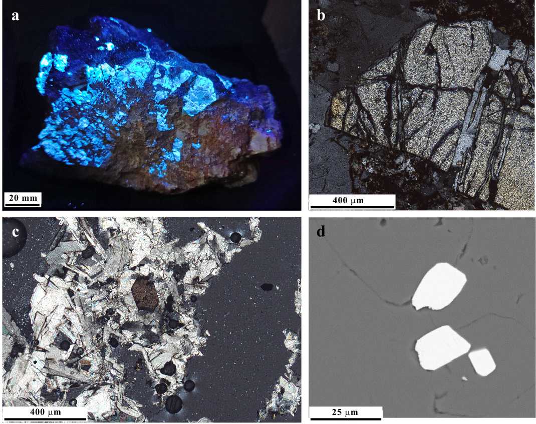 Рис. 1. Гнездообразное скопление шеелита в ожелезненном кварце под УФ-лампой (а); раздробленное зерно шеелита. Проходящий свет, николи скрещены (b); идиоморфное выделение шеелита в кальцитовом прожилке. Проходящий свет, николи скрещены (c); мелкие вкрапленные выделения шеелита в кварце. СЭМ (d)