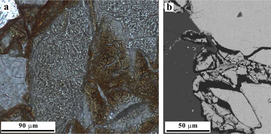Рис. 3. Каймы тунгстита вокруг зерен шеелита. Проходящий свет, николи параллельны (a). Изображение в обратнорассеянных электронах. СЭМ (b)