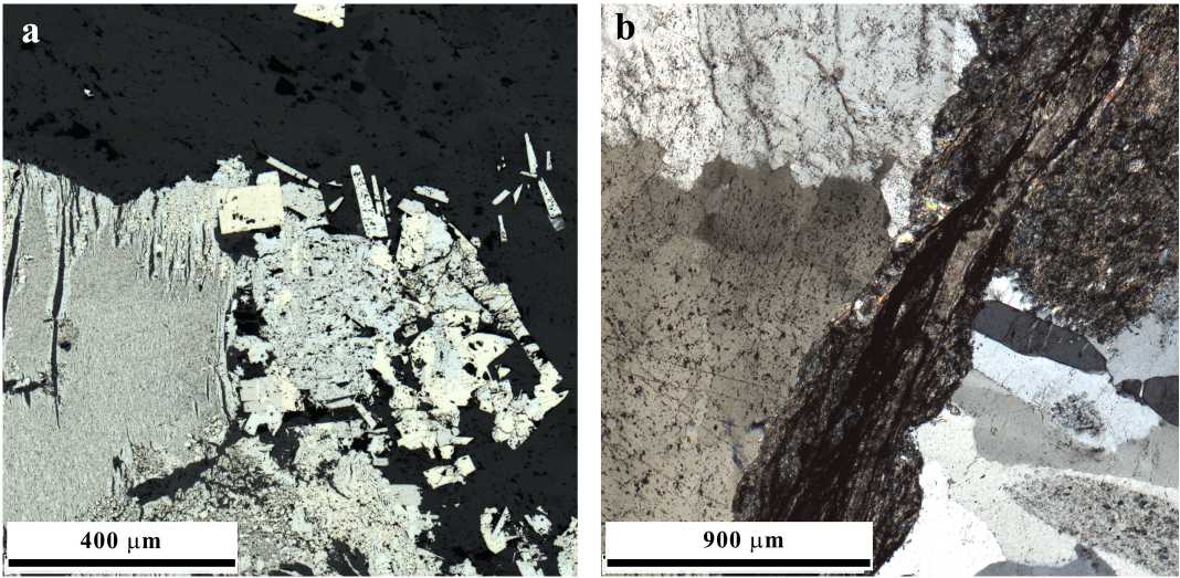 Рис. 4. Агрегат пирита и арсенопирита. Отраженный свет, николи параллельны (а). Удлиненные зерна апатита в кварце. Проходящий свет, николи скрещены (b)