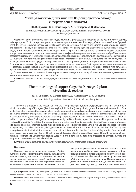 Объектом настоящего изучения стали медные шлаки Кировградского (первоначально Калатинского) завода, действующего с 1914 г., вокруг которого постепенно вырос современный Кировград (Свердловская область, Средний Урал). Вещественный состав исследованных образцов получен методами сканирующей электронной микроскопии и масс-спектрометрии с индуктивно связанной плазмой. Установлено, что они представлены двумя типами, отличающимися друг от друга минералого-геохимическими характеристиками. Первый тип шлаков сложен фаялит-авгитовым агрегатом с присутствием магнетита, хромита и арсенидно-стибнидно-сульфидной минерализации, а также меди и серебра. Халькогениды представлены троилитом, кубанитом, хейкокитом, рудашевскитом, галенитом, брейтгауптитом, вестервельдитом и сульфидами Cu-Fe. Второй тип представлен фаялит-геденбергитовым агрегатом со значительным присутствием магнетита, стекла и арсенидно-стибнидно-сульфидной минерализации, а также барковита, меди и серебра. Халькогениды представлены борнитом, халькозином, сфалеритом, галенитом, пентландитом, хизлевудитом, брейтгауптитом, никелином и шандитом. Минералогия шлаков хорошо согласуется с их микроэлементным составом. Возможно, что шлаки первого типа получились в результате переплавки медноколчеданных руд Левихинской группы месторождений, а второго типа — полиметаллических руд Сафьяновского месторождения. Шлаки Кировградского завода можно переработать с выделением сульфидного и магнетитового концентратов и попутного серебра.