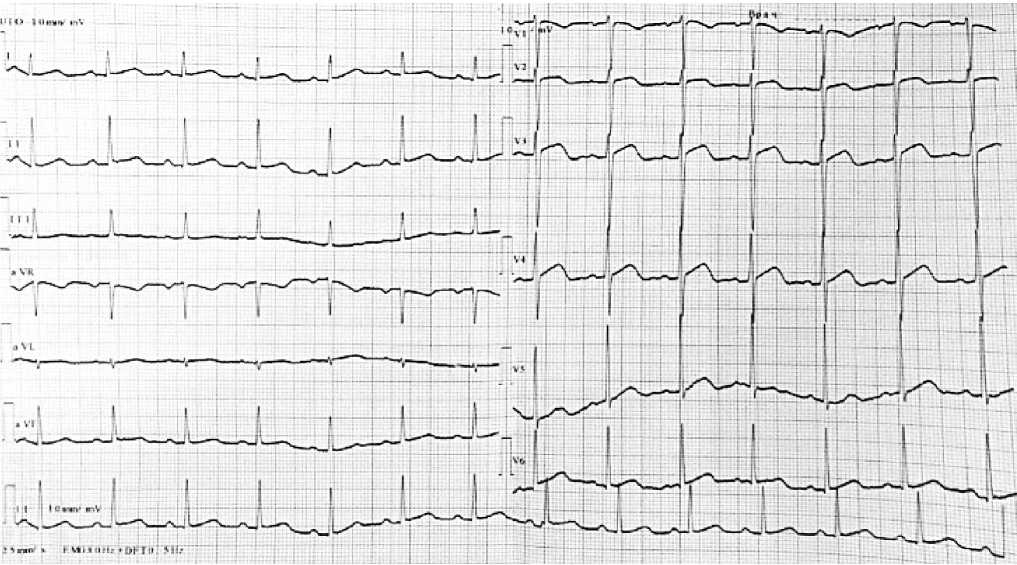 При поступлении : общее состояние пациента расценено как крайне тяжёлое. Сознание ясное, на вопросы отвечает адекватно, но с некоторым замедлением. Кожные покровы и видимые слизистые оболочки бледные, с незначительным иктеричным оттенком. Отмечается выраженное набухание шейных вен, пастозность голеней и стоп. Частота дыхания — 26 в минуту. Сатурация кислорода на атмосферном воздухе в покое — 87-88%. При аускультации — незвучные влажные хрипы в нижних отделах лёгких. Частота сердечных сокращений (ЧСС) — 86 в минуту, артериальное давление (АД) — 120/80 мм рт. ст. Границы относительной сердечной тупости смещены влево на 1 см от средней ключичной линии. I тон на верхушке сердца ослаблен. Живот мягкий, безболезненный при пальпации. Печень безболезненная, не выступает из-под края рёберной дуги. Селезёнка не увеличена. Почки не пальпируются. Симптом поколачивания по поясничным областям отрицательный. По данным ЭКГ от 29.04.2025 — умеренная синусовая тахикардия, подъём сегмента S-T в отведениях, отражающих переднюю стенку левого желудочка (Рисунок 1).