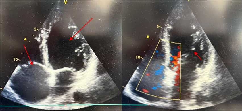 Рисунок 2. Эхокардиографическая картина миокардита у пациента А., 38 лет. Увеличение полости левого желудочка и митральная регургитация