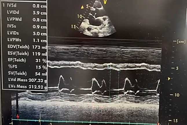 Рисунок 3. Эхокардиография пациента А., 38 лет с миокардитом. В М-режиме графическое движение стенок сердца и створок клапанов во времени / оценка систолической функции желудочков