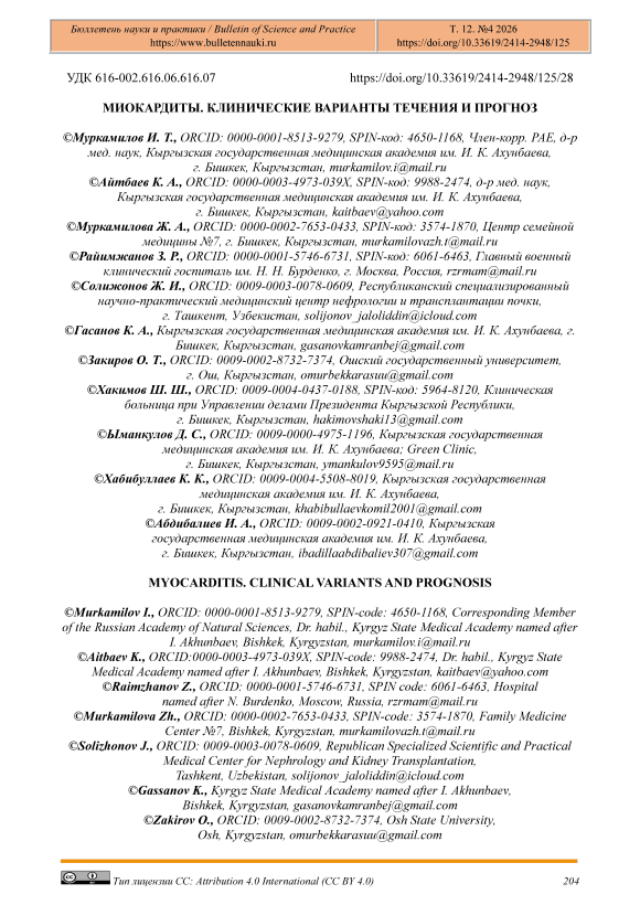 Вклад авторов. Все авторы подтверждают соответствие своего авторства согласно международным критериям ICMJE. Авторский вклад (по системе Credit): Муркамилов И.Т. – проведение исследования, верификация данных, создание черновика рукописи, визуализация; Айтбаев К.А. – концептуализация; Муркамилова Ж.А. – создание рукописи, методология; Райимжанов З.Р., Солижонов Ж.И., Гасанов К.А., Закиров О.Т., Хакимов Ш.Ш., Ыманкулов Д.С., Хабибуллаев К.К., Абдибалиев И.А. - проведение исследования, ресурсы и методология.