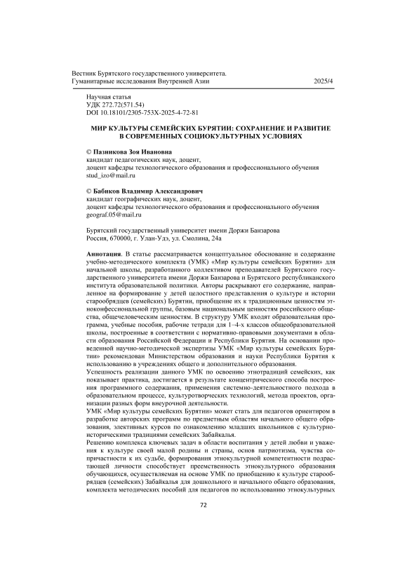 Пазникова З. И., Бабиков В. А. Мир культуры семейских Бурятии: сохранение и развитие в современных социокультурных условиях // Вестник Бурятского государственного университета. Гуманитарные исследования Внутренней Азии. 2025. Вып. 4. С. 72–81.