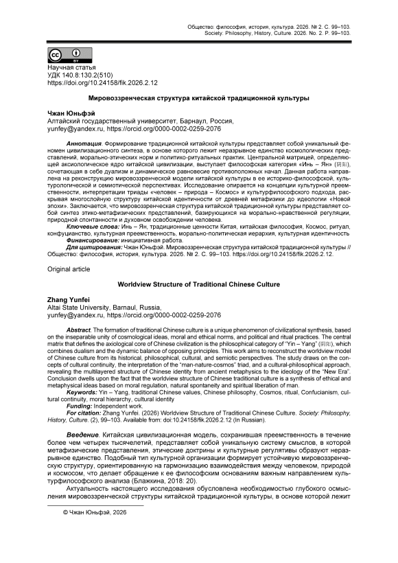 Формирование традиционной китайской культуры представляет собой уникальный феномен цивилизационного синтеза, в основе которого лежит неразрывное единство космологических представлений, морально-этических норм и политико-ритуальных практик. Центральной матрицей, определяющей аксиологическое ядро китайской цивилизации, выступает философская категория «Инь – Ян» (阴阳), сочетающая в себе дуализм и динамическое равновесие противоположных начал. Данная работа направлена на реконструкцию мировоззренческой модели китайской культуры в ее историко-философской, культурологической и семиотической перспективах. Исследование опирается на концепции культурной преемственности, интерпретации триады «человек – природа – Космос» и культурфилософского подхода, раскрывая многослойную структуру китайской идентичности от древней метафизики до идеологии «Новой эпохи». Заключается, что мировоззренческая структура китайской традиционной культуры представляет собой синтез этико-метафизических представлений, базирующихся на морально-нравственной регуляции, природной спонтанности и духовном освобождении человека.