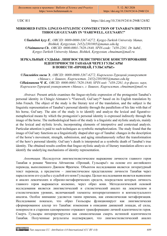 Present article examines the linguo-stylistic expression of the protagonist Tanabai’s personal identity in Chingiz Aitmatov’s *Farewell, Gul’sary!* based on its English translation by John French. The object of the study is the literary text of the translation, and the subject is the linguistic representation of Tanabai’s personal identity through the parallelism of his fate with that of his horse, Gul’sary. The aim of the study is to identify and analyze the lexical and figurative-metaphorical means by which the protagonist’s personal identity is expressed indirectly through the image of the horse. The methodological basis of the study is a linguistic and stylistic analysis, mainly at the lexical and stylistic levels, incorporating elements of interpretive and contextual analysis. Particular attention is paid to such techniques as symbolic metaphorization. The study found that the image of Gul’sary functions as a linguistically shaped alter ego of Tanabai: changes in the description of the horse’s movement, strength, submission, and aging simultaneously reflect the transformation of the hero’s personal identity. Gul’sary’s death is interpreted as a symbolic death of Tanabai’s true identity. The obtained results confirm that linguo-stylistic analysis of literary translation allows us to identify the underlying mechanisms of identity representation.
