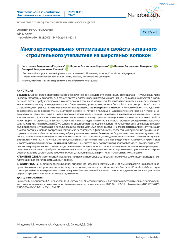 Введение. Сейчас остро стоят вопросы по обеспечению производств отечественными материалами, не уступающими по качеству импортным аналогам, для строительства и восстановления разрушенного жилья и социальных объектов в новых регионах России, требуются строительные материалы, в том числе утеплители. Теплоизоляторы из овечьей шерсти являются экологичными, легко утилизируемыми и возобновляемыми, для придания огнеи биостойкости их следуют обработать соответствующими препаратами на этапе отделки при производстве. Материалы и методы. В качестве объекта исследования выбран нетканый термоскрепленный материал из волокон грубой и полугрубой шерсти и бикомпонентных полиэфирных волокон в качестве связующего, представляющий собой перспективное направление в разработке экологически чистых и эффективных теплои звукоизоляционных материалов, ключевую роль в формировании их эксплуатационных свойств играет пористая структура, в частности, наличие наноструктуры – нанопор и каналов, проведен эксперимент с использованием матрицы планирования КОНО-2, получены регрессионные модели свойств нетканого полотна, для каждой модели была проведена оптимизация с использованием среды MathCAD, затем выполнена многокритериальная оптимизация с использованием метода построения комплексного показателя эффективности, проведен эксперимент по приданию негорючести и огнестойкости оптимальному образцу нетканого полотна. Результаты. Разработана технология получения объемных нетканых теплоизоляционных полотен строительного назначения, проведена многокритериальная оптимизация для определения образца с наилучшими эксплуатационными свойствами: повышенной воздухопроницаемостью, прочностью и достаточной растяжимостью. Заключение. Полученные результаты подтверждают целесообразность применения методов многокритериальной оптимизации для анализа текстильных процессов, использование комплексного безразмерного показателя позволило подобрать оптимальные параметры производства нетканого строительного утеплителя из шерсти, обеспечивающие соответствие требуемым эксплуатационным характеристикам по основным показателям.