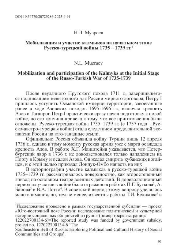 К.П. Шовунова6. На современном этапе интерес к теме значительно возрос: с конца 1990-х гг. было опубликовано большое количество научных работ, среди которых можно отметить исследования М.М. Батмаева7, А.В. Цюрюмова8, В.В. Батырова9 и У.Б. Очирова10. В настоящее время комплексный анализ участия калмыцкого войска в русско-турецкой войне 1735–1739 гг., основанный на использовании ранее не публиковавшихся архивных источников, представлен в работах В.Т. Тепкеева11.