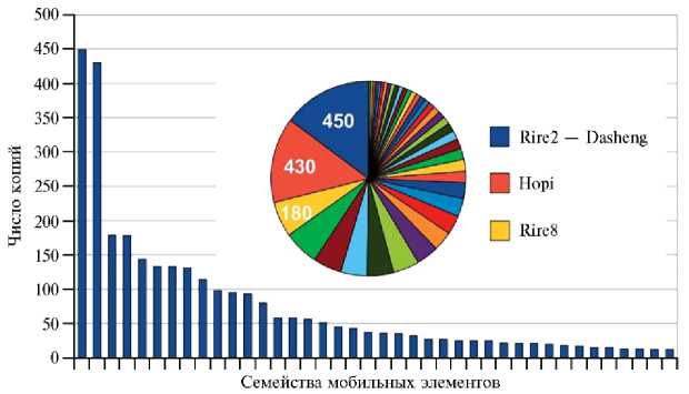 O. sativa содержит как минимум 109 Мб LTR ретротранспозонов, что составляет 29 % генома (12), то есть большую часть всех мобильных элементов. В целом их насчитывают более 13000 (12, 19). У O. sativa LTR представлены 340 семействами и 3663 локусами, полностью покрывающими LTR ретротранспозоны в геноме. Лидируют по числу копий семейства Das-heng (450 копий) и Hopi (430 копий), остальные семейства представлены относительно небольшим, до 180, числом копий (6) (рис. 1). Из LINE мобильных элементов у риса встречаются TEs семейств Karma и Lullaby (5, 10, 20), активными ДНК-транспозонами считаются dTok, nDart и mPing/Pong