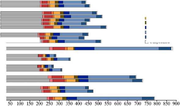 Рис. 2. Количество основных классов мобильных элементов (в мегабазах) рода Oryza L. Содержимое, не относящееся к транспозонам, обозначено серым цветом. Субгеномы вида упорядочены по типу генома ( BB , CC , DD , EE , KK , LL , HH , JJ , GG ) (26).