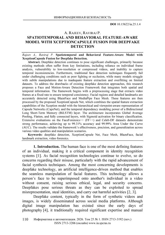 Обнаружение дипфейков по-прежнему представляет собой серьезную проблему, главным образом из-за ключевых ограничений существующих методов, включая зависимость от анализа отдельных кадров, уязвимость к видео низкого разрешения или сжатым видео, а также неспособность улавливать временные несоответствия. Кроме того, традиционные методы обнаружения лиц часто дают сбой в сложных условиях, таких как плохое освещение или окклюзия, а многие модели не справляются с тонкими манипуляциями из-за неадекватного извлечения признаков и переобучения на ограниченных наборах данных. Для устранения недостатков существующих подходов к обнаружению дипфейков в данном исследовании предлагается система обнаружения лиц и движений, которая объединяет как пространственную, так и временную информацию. Работа системы начинается с этапа предварительной обработки, на котором видеокадры извлекаются с фиксированной частотой для обеспечения временной согласованности. Области лица и детальные ориентиры точно определяются с помощью BlazeFace и MediaPipe Face Mesh. Затем эти признаки обрабатываются с помощью предлагаемой сети XceptionCapsule Net, которая сочетает в себе возможности извлечения пространственных признаков модели Xception с иерархическим и учитывающим ракурс представлением капсульных сетей (CapsNet), а также возможностью моделирования временных зависимостей двунаправленного слоя долгой краткосрочной памяти (BiLSTM). Архитектура включает в себя глобальный усредняющий пулинг, сглаживание и полносвязные слои с сигмоидной функцией активации для бинарной классификации. Обширные оценки на наборах данных FaceForensics++ (FF++) и Celeb-DF демонстрируют высокую производительность, достигая точности до 99,31% и площади под кривой (AUC) 99,99%. Результаты подтверждают эффективность, точность и обобщающую способность системы для видео различного качества и сценариев манипуляций.