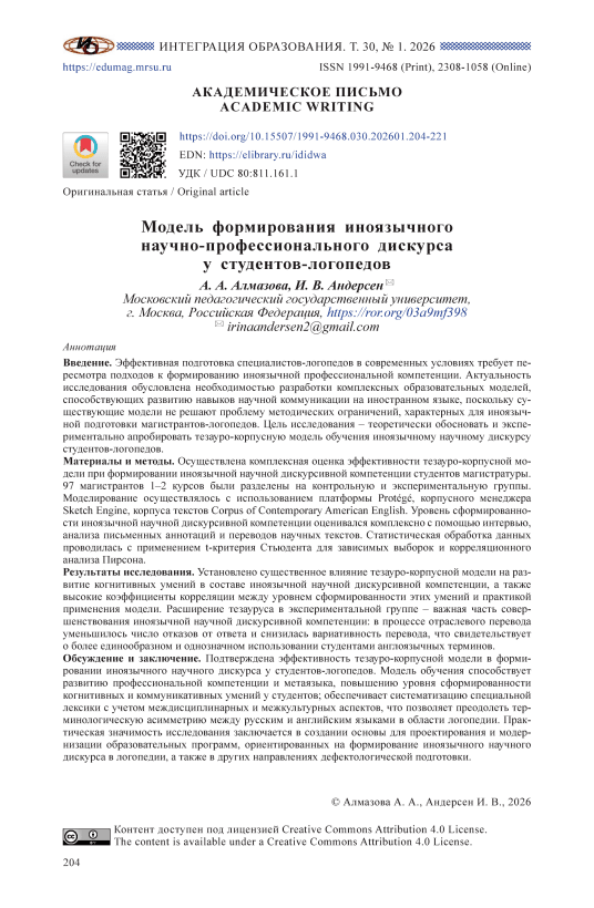 Введение. Эффективная подготовка специалистов-логопедов в современных условиях требует пересмотра подходов к формированию иноязычной профессиональной компетенции. Актуальность исследования обусловлена необходимостью разработки комплексных образовательных моделей, способствующих развитию навыков научной коммуникации на иностранном языке, поскольку существующие модели не решают проблему методических ограничений, характерных для иноязычной подготовки магистрантов-логопедов. Цель исследования – теоретически обосновать и экспериментально апробировать тезауро-корпусную модель обучения иноязычному научному дискурсу студентов-логопедов. Материалы и методы. Осуществлена комплексная оценка эффективности тезауро-корпусной модели при формировании иноязычной научной дискурсивной компетенции студентов магистратуры. 97 магистрантов 1–2 курсов были разделены на контрольную и экспериментальную группы. Моделирование осуществлялось с использованием платформы Protégé, корпусного менеджера Sketch Engine, корпуса текстов Corpus of Contemporary American English. Уровень сформированности иноязычной научной дискурсивной компетенции оценивался комплексно с помощью интервью, анализа письменных аннотаций и переводов научных текстов. Статистическая обработка данных проводилась с применением t-критерия Стьюдента для зависимых выборок и корреляционного анализа Пирсона. Результаты исследования. Установлено существенное влияние тезауро-корпусной модели на развитие когнитивных умений в составе иноязычной научной дискурсивной компетенции, а также высокие коэффициенты корреляции между уровнем сформированности этих умений и практикой применения модели. Расширение тезауруса в экспериментальной группе – важная часть совершенствования иноязычной научной дискурсивной компетенции: в процессе отраслевого перевода уменьшилось число отказов от ответа и снизилась вариативность перевода, что свидетельствует о более единообразном и однозначном использовании студентами англоязычных терминов. Обсуждение и заключение. Подтверждена эффективность тезауро-корпусной модели в формировании иноязычного научного дискурса у студентов-логопедов. Модель обучения способствует развитию профессиональной компетенции и метаязыка, повышению уровня сформированности когнитивных и коммуникативных умений у студентов; обеспечивает систематизацию специальной лексики с учетом междисциплинарных и межкультурных аспектов, что позволяет преодолеть терминологическую асимметрию между русским и английским языками в области логопедии. Практическая значимость исследования заключается в создании основы для проектирования и модернизации образовательных программ, ориентированных на формирование иноязычного научного дискурса в логопедии, а также в других направлениях дефектологической подготовки.