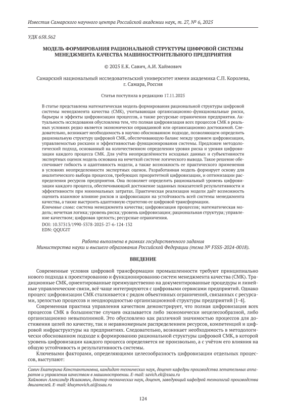 В статье представлена математическая модель формирования рациональной структуры цифровой системы менеджмента качества (СМК), учитывающая организационно-функциональные риски, барьеры и эффекты цифровизации процессов, а также ресурсные ограничения предприятия. Актуальность исследования обусловлена тем, что полная цифровизация всех процессов СМК в реальных условиях редко является экономически оправданной или организационно достижимой. Следовательно, возникает необходимость в научно обоснованном подходе, позволяющем определить рациональную структуру цифровой СМК, обеспечивающую баланс между уровнем цифровизации, управляемостью рисками и эффективностью функционирования системы. Предложен методологический подход, основанный на количественном определении уровня риска и уровня цифровизации каждого процесса СМК. Для учёта неопределённости исходных данных и субъективности экспертных оценок модель основана на нечеткой системе логического вывода. Такое решение обеспечивает гибкость и адаптивность модели, а также возможность ее практического применения в условиях неопределенности экспертных оценок. Разработанная модель формирует основу для аналитического выбора процессов, требующих приоритетной цифровизации, и оптимизации распределения ресурсов предприятия. Она позволяет определить рациональный уровень цифровизации каждого процесса, обеспечивающий достижение заданных показателей результативности и эффективности при минимальных затратах. Практическая реализация модели даёт возможность оценить взаимное влияние рисков и цифровизации на устойчивость всей системы менеджмента качества, а также выстроить адаптивную стратегию ее цифровой трансформации.