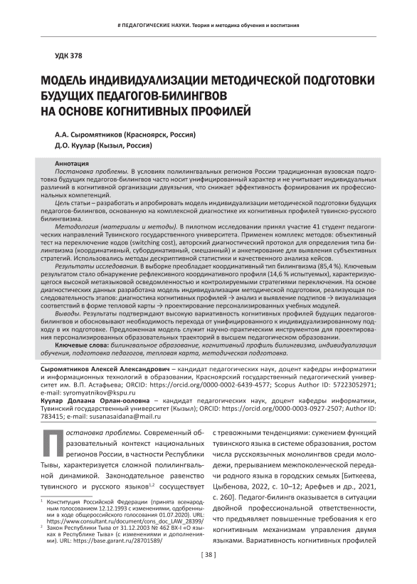 Постановка проблемы. В условиях полилингвальных регионов России традиционная вузовская подготовка будущих педагогов-билингвов часто носит унифицированный характер и не учитывает индивидуальных различий в когнитивной организации двуязычия, что снижает эффективность формирования их профессиональных компетенций. Цель статьи – разработать и апробировать модель индивидуализации методической подготовки будущих педагогов-билингвов, основанную на комплексной диагностике их когнитивных профилей тувинско-русского билингвизма. Методология (материалы и методы). В пилотном исследовании принял участие 41 студент педагогических направлений Тувинского государственного университета. Применен комплекс методов: объективный тест на переключение кодов (switching cost), авторский диагностический протокол для определения типа билингвизма (координативный, субординативный, смешанный) и анкетирование для выявления субъективных стратегий. Использовались методы дескриптивной статистики и качественного анализа кейсов. Результаты исследования. В выборке преобладает координативный тип билингвизма (85,4 %). Ключевым результатом стало обнаружение рефлексивного координативного профиля (14,6 % испытуемых), характеризующегося высокой метаязыковой осведомленностью и контролируемыми стратегиями переключения. На основе диагностических данных разработана модель индивидуализации методической подготовки, реализующая последовательность этапов: диагностика когнитивных профилей → анализ и выявление подтипов → визуализация соответствий в форме тепловой карты → проектирование персонализированных учебных модулей. Выводы. Результаты подтверждают высокую вариативность когнитивных профилей будущих педагогов-билингвов и обосновывают необходимость перехода от унифицированного к индивидуализированному подходу в их подготовке. Предложенная модель служит научно-практическим инструментом для проектирования персонализированных образовательных траекторий в высшем педагогическом образовании.