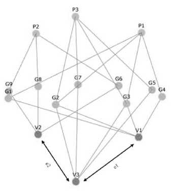 Примем в рассматриваемом случае соответствие вершин первой плоскости ( v ) соответствующим вершинам третьей плоскости ( р ) . Вершины g 2 и g 3 в рассматриваемом случае являются альтернативными. В таблице 2 представлена матрица формирования гиперребер в момент времени t 1 .