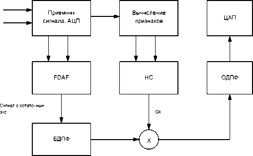 На рисунке 1 представлена структурная схема предлагаемого решения. В состав однокристального вычислителя входят: двухканальный приёмник аналогового аудиосигнала, принимающий входной сигнал с микрофона (Mic-End) и эхо-сигнал «с дальнего конца» (Far-end), обрабатываемые посредством аналого-цифрового преобразователя (АЦП). Также в состав вычислителя входят: модуль вычисления признаков сигнала, адаптивный фильтр фильтрации в частотной области (например FDAF), модуль быстрого преобразования Фурье БДПФ, нейросеть (НС), слой для перемножения полученных от НС коэффициентов со спектром сигнала (Х), модуль для вычисления обратного преобразования Фурье (ОДПФ) и цифро-аналоговый преобразователь (ЦАП).