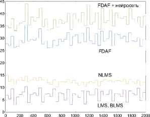 При экспериментальной оценке качества подавления эха с применением алгоритмов адаптивной фильтрации было выявлено, что алгоритм адаптивной фильтрации в частотной области (FDAF) показывает наилучшие результаты (рисунок 2) . Однако все алгоритмы оказывают влияние на