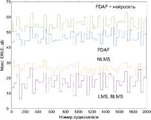 В таблице 1 представлены результаты сравнительного анализа для алгоритмов LMS, NLMS, BLMS, FDAF, а также комбинированного FDAF с нейросетевым модулем архитектуры LSTM. Приведены среднее и среднее-максимальное значение метрики ERLE.