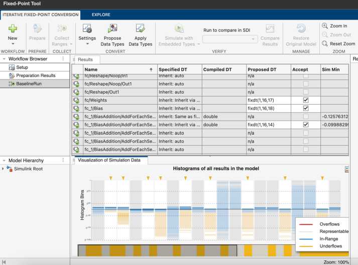 Fixed Point Tool предлагает два режима преобразования: автоматизированный и итеративный, с возможностью ручной модификации. Последний был использован в данном эксперименте. Алгоритм конвертации модели нейронной сети в целочисленную с помощью Fixed Point tool включал следующие основные шаги:
