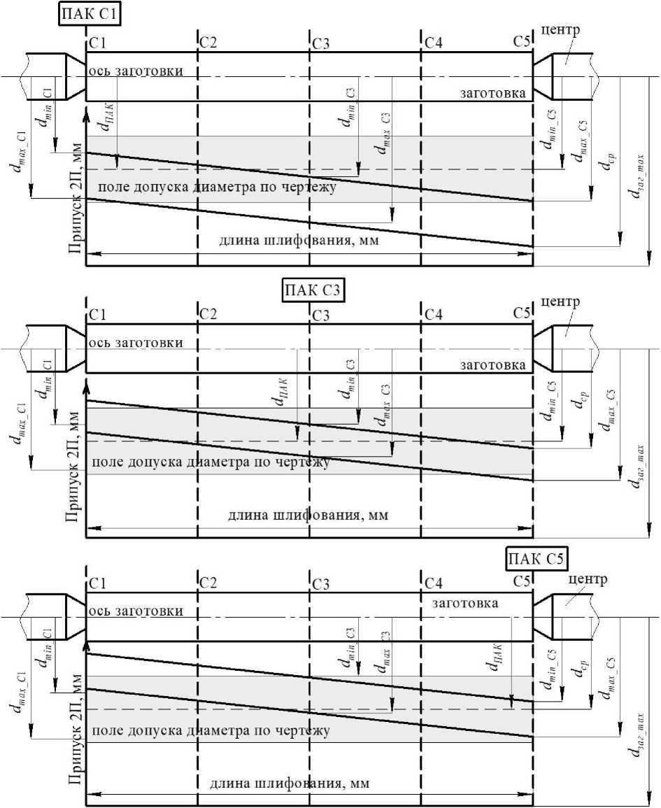 Выделим на всей длине заготовки 5 сечений на равном расстоянии друг от друга (начальное - С1, среднее - С3 и конечное - С5), имеющих разную податливость (рис. 1). Величина снимаемого припуска в каждом сечении будет иметь свое значение, так как податливость заготовки переменна по длине. Поэтому величина снимаемого припуска для каждого сечения также будет различной, так как ПАК может быть установлен в произвольном месте и настроечный диаметр ПАКа может совпасть с любым из пяти диаметров. На рис. 1 показано изменение снимаемого припуска при размещении ПАК в разных сечениях. В результате можно сказать о том, что различное расположение ПАК на длине заготовки оказывает значительное влияние на точность обработки.