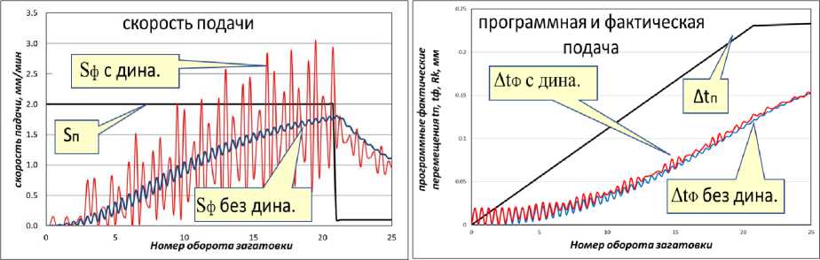 Рис. 3. График изменения скорости врезной подачи (а), программной и фактической подачи (b), силы резания (c) и упругих деформаций технологической системы (d) с учетом динамики и без учета динамики